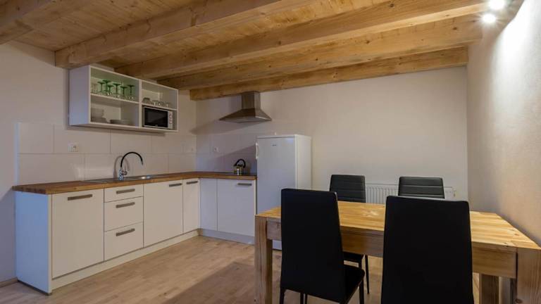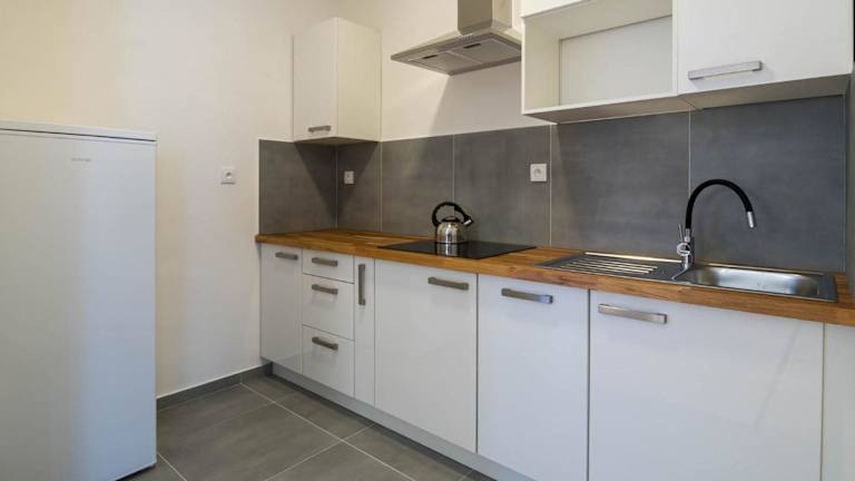 In manchen Wohneinheiten gibt es eine Küche mit einem Kühlschrank, Geschirrspüler und Mikrowelle.