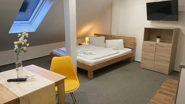Das Mikulov Inn - Apartments Slunce in Mikulov bietet seinen Gästen eine moderne und komfortable Unterkunft in einer günstigen Lage. Mit kostenfreiem WLAN und Privatparkplätzen können Sie Ihren Aufenthalt in vollen Zügen genießen. Die Pension liegt in der Nähe von Sehenswürdigkeiten wie dem Schloss Valtice und der Kolonnade na Reistně. Die Zimmer sind stilvoll eingerichtet und verfügen über ein eigenes Bad, einen Flachbild-TV und Klimaanlage. Ein kontinentales Frühstück wird täglich serviert, und es gibt auch eine Terrasse, auf der Sie entspannen können. In der Umgebung gibt es zahlreiche Möglichkeiten für Aktivitäten wie Radfahren.