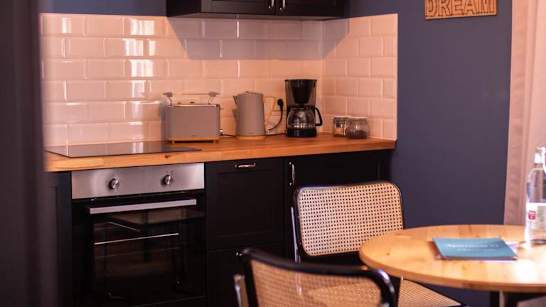 Das Apartment bietet ein Schlafzimmer und ist ausgestattet mit einem Flachbild-TV sowie einer gut ausgestatteten Küchenzeile, die einen Kühlschrank und einen Geschirrspüler einschliesst. Des Weiteren ist ein Badezimmer mit einer Dusche vorhanden. Handtücher und Bettwäsche werden bereitgestellt, was zur Bequemlichkeit der Gäste beiträgt.