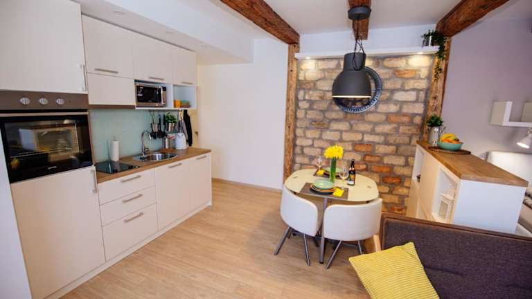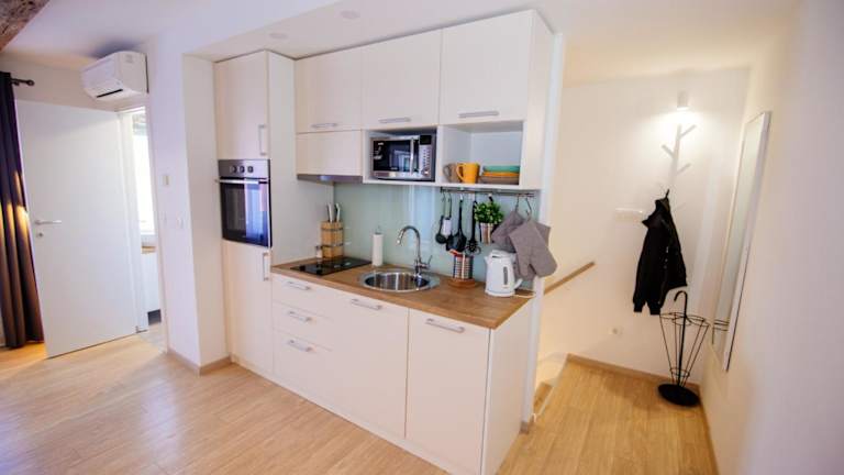 Die Ferienwohnung besteht aus einem Schlafzimmer, einem Wohnzimmer und einer voll ausgestatteten Küche mit Kühlschrank und Wasserkocher. Das Badezimmer ist mit einer Dusche und kostenlosen Pflegeprodukten ausgestattet. Zudem sind eine Klimaanlage, kostenfreies WLAN sowie Handtücher und Bettwäsche vorhanden.