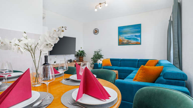 Die Ferienwohnung bietet 3 Schlafzimmer, ein Wohnzimmer mit Flachbild-TV, eine gut ausgestattete Küche mit Kühlschrank und Geschirrspüler sowie ein Badezimmer mit Badewanne. Es sind Handtücher und Bettwäsche vorhanden.