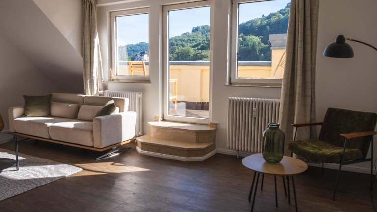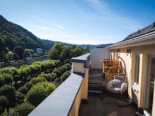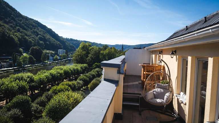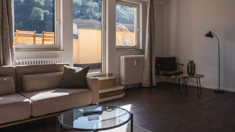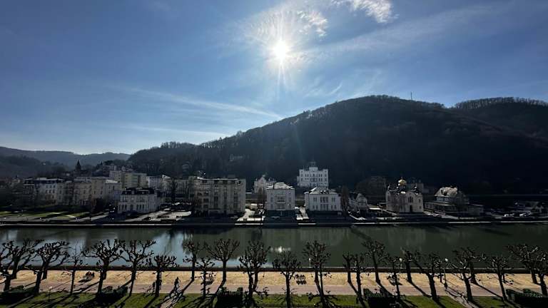 Die Unterkunft befindet sich in der Nähe des Kurparks und bietet einen schönen Blick auf den Fluss sowie Bergblicke. In der Umgebung gibt es zahlreiche Möglichkeiten für Freizeitaktivitäten wie Velofahren, Wandern und kulturelle Unternehmungen wie Besuche im Theater.