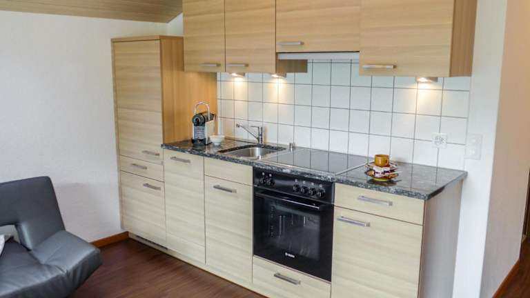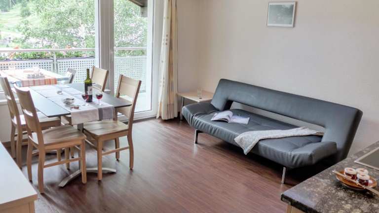 Die Ferienwohnung ist gut ausgestattet und verfügt über einen Balkon, der einen wunderschönen Bergblick bietet. Eine gut ausgestattete Küche mit Kühlschrank, Geschirrspüler und Ofen ist vorhanden. Das Wohnzimmer ist mit Satelliten TV ausgestattet und das Badezimmer bietet eine Badewanne sowie einen Haartrockner.