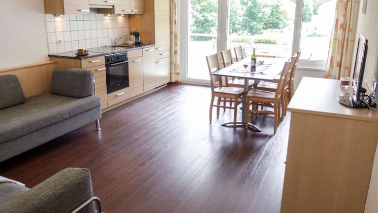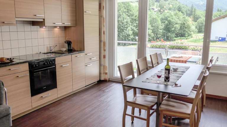 Die Ferienwohnung umfasst zwei Schlafzimmer, ein Wohnzimmer und ein Badezimmer mit Badewanne. Zur Ausstattung gehört ein Balkon mit Blick auf die Berge, ein TV sowie eine gut ausgestattete Küche mit Kühlschrank und Geschirrspüler.