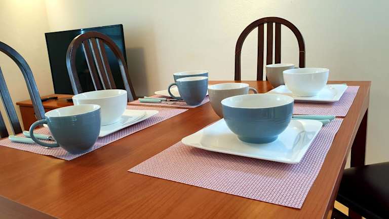 Die Ferienwohnung verfügt über zwei Schlafzimmer, ein Badezimmer, Bettwäsche und Handtücher. Ein Flachbild-TV mit Kabelkanälen, ein Essbereich sowie eine voll ausgestattete Küche sind ebenfalls vorhanden. Die Terrasse bietet einen Blick auf den Garten.