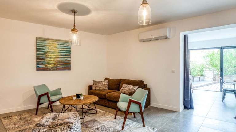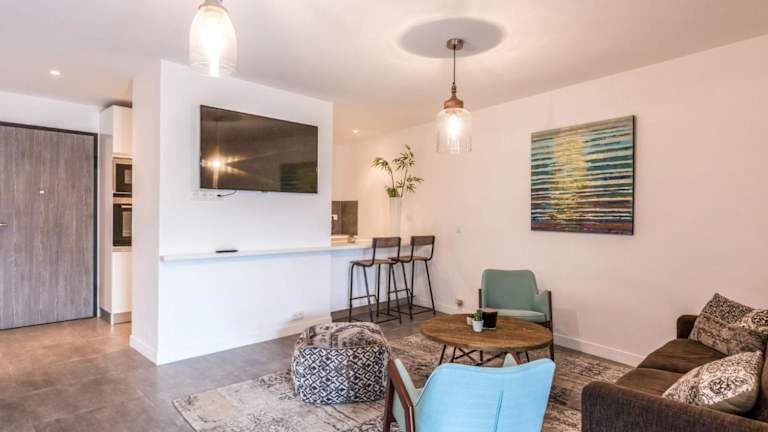 Das Apartment umfasst 1 Schlafzimmer, ein Wohnzimmer und eine voll ausgestattete Küche mit Kühlschrank und Kaffeemaschine. Es bietet zudem ein Badezimmer mit Dusche und einen Fernseher. Handtücher können gegen Gebühr ausgeliehen oder selbst mitgebracht werden.
