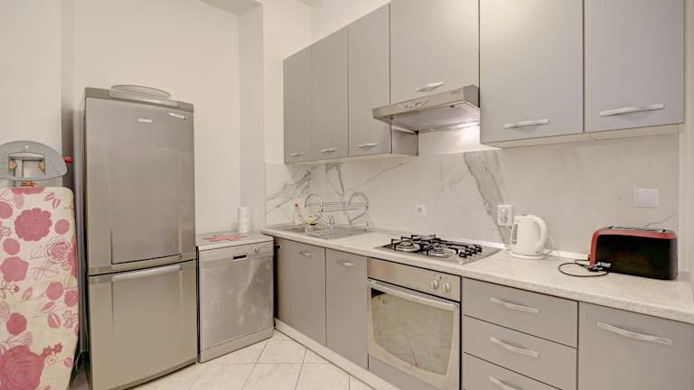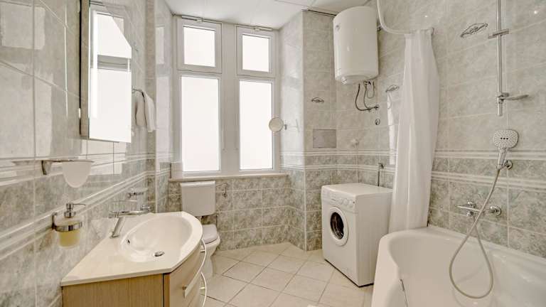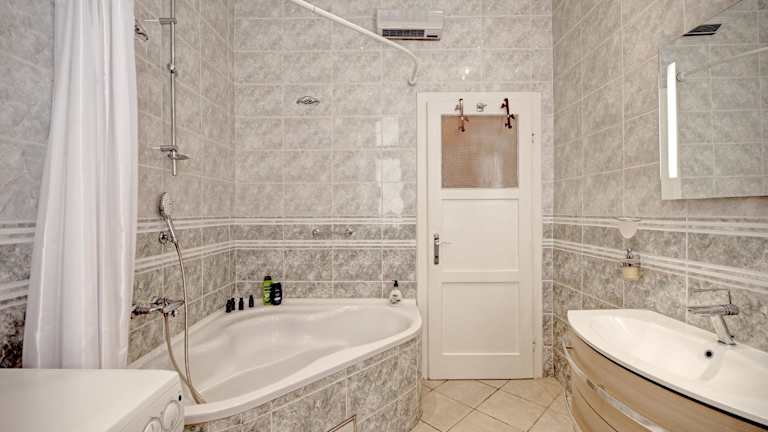 Das Apartment ist mit einer Hydromassagedusche und einer Waschmaschine im Badezimmer ausgestattet. Es bietet auch schallisolierte Zimmer sowie eine Klimaanlage für die Bequemlichkeit der Gäste.