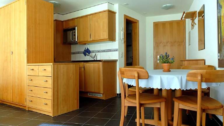 Die Ferienwohnung verfügt über ein Schlafzimmer und ein Badezimmer. Sie ist ausgestattet mit Bettwäsche, Handtüchern und einem Flachbild-TV mit Satellitenkanälen. Eine voll ausgestattete Küchenzeile sowie ein Essbereich sind vorhanden. Zudem bietet die Terrasse einen schönen Bergblick.