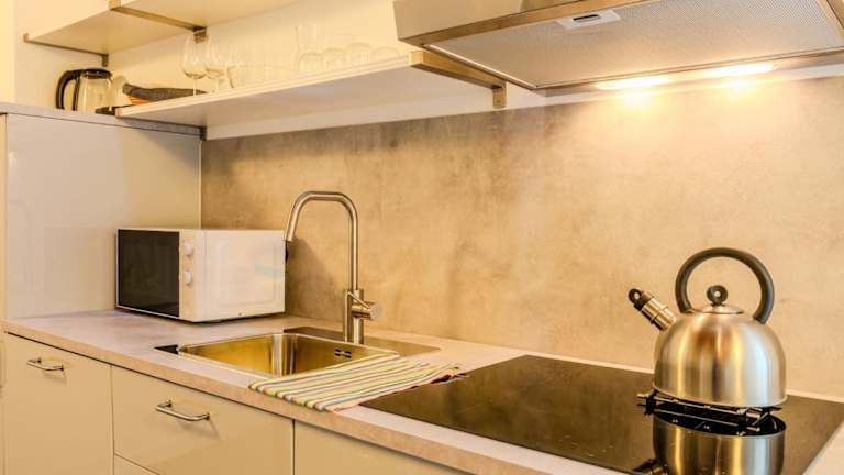 Die Ferienwohnung verfügt über eine komplett ausgestattete Küche, die einen Kühlschrank, Geschirrspüler und eine Herdplatte umfasst. Eine Bar ist ebenfalls vorhanden, jedoch sind keine spezifischen Informationen zu anderen Verpflegungsmöglichkeiten angegeben.