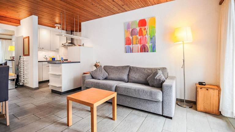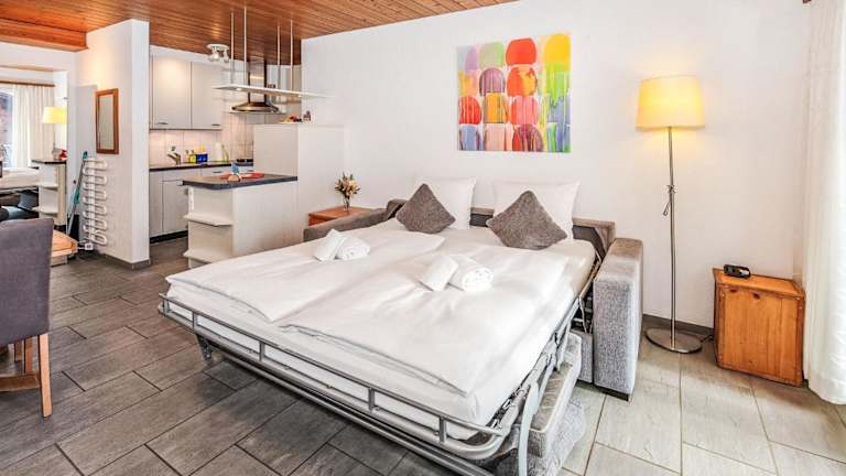 Das Apartment verfügt über 1 Schlafzimmer, ein heimeliges Wohnzimmer mit TV sowie eine gut ausgestattete Küche, die mit einem Kühlschrank und einem Geschirrspüler versehen ist. Das Badezimmer ist mit einer Dusche ausgestattet.
