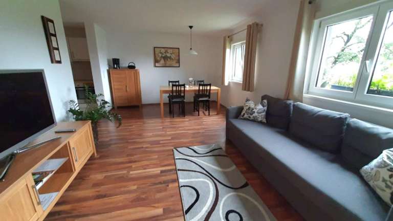 Die Ferienwohnung umfasst 1 Schlafzimmer, ein Wohnzimmer mit TV und eine gut ausgestattete Küche mit Kühlschrank und Geschirrspüler. Zudem ist ein Badezimmer mit Dusche vorhanden, und von der Terrasse aus bietet sich ein schöner Bergblick. Ein Babybett ist kostenfrei erhältlich.