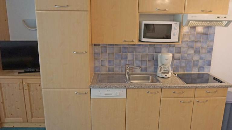 Die Ferienwohnung verfügt über 2 Schlafzimmer, ein Wohnzimmer mit TV sowie eine gut ausgestattete Küche mit Kühlschrank und Geschirrspüler. Zudem stehen 2 Badezimmer mit Dusche zur Verfügung. Eine Terrasse mit Blick auf die Berge lädt zum Entspannen ein.