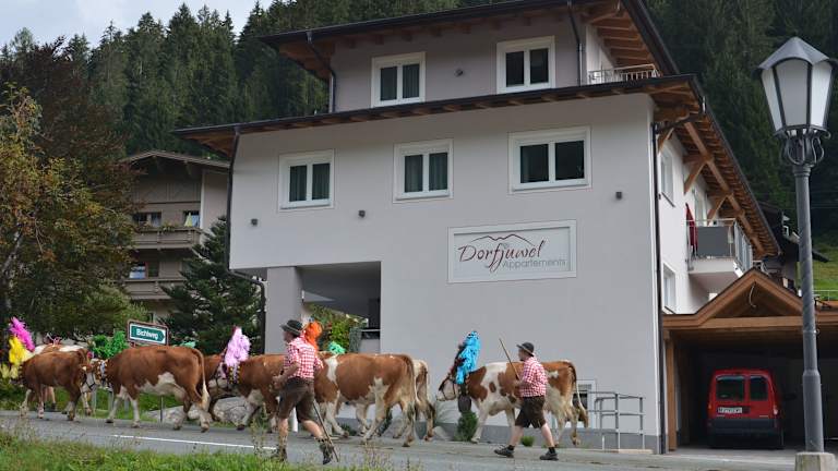 Jede Wohneinheit im Apartment Dorfjuwel ist mit einer komfortablen Küche ausgestattet, die einen Kühlschrank, Geschirrspüler, einen Ofen, eine Mikrowelle, Herdplatte, Kaffeemaschine und Wasserkocher umfasst. Zudem verfügen die Apartments über einen Safe, einen Satelliten-Flachbild-TV, Bügelmöglichkeiten, einen Schreibtisch und einen Sitzbereich mit einem Schlafsofa. Eine Terrasse ist ebenfalls vorhanden.