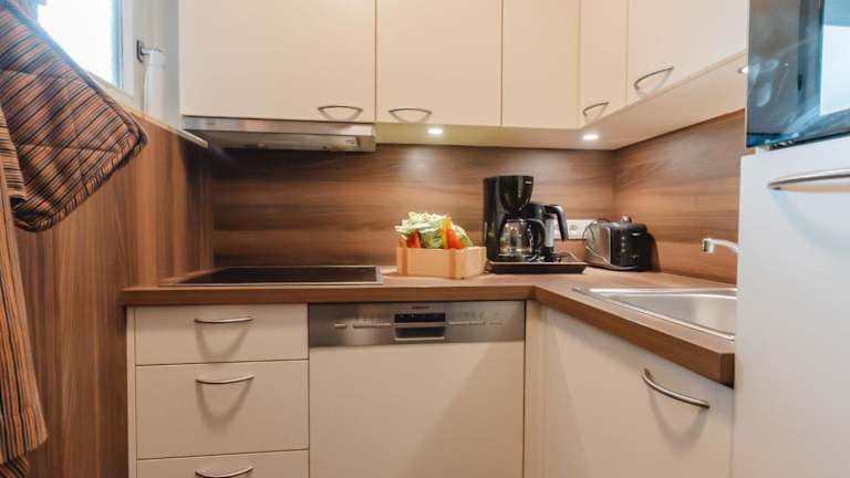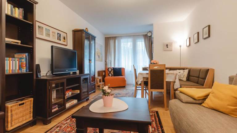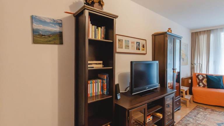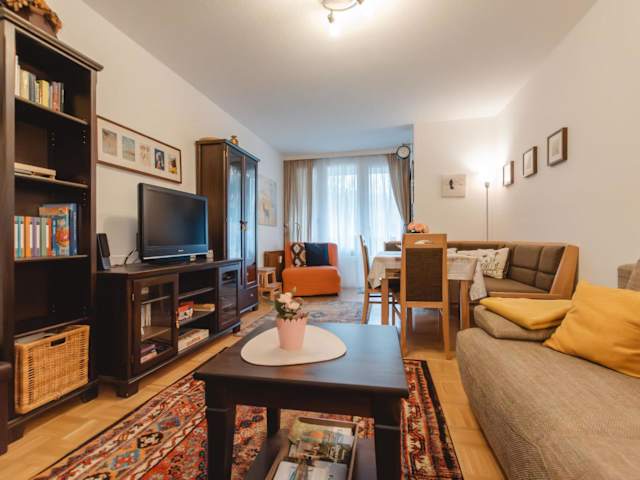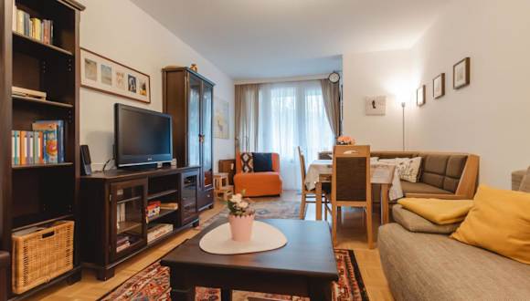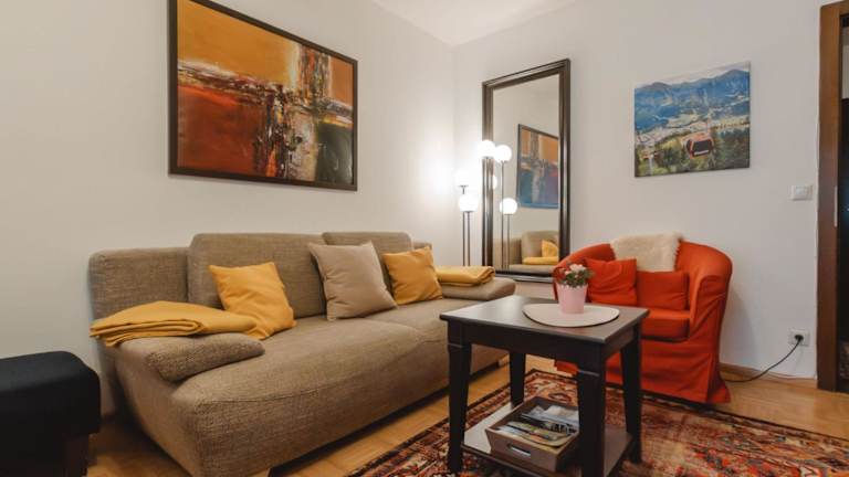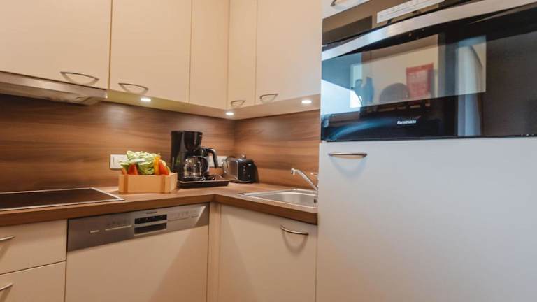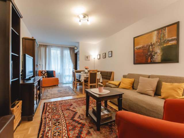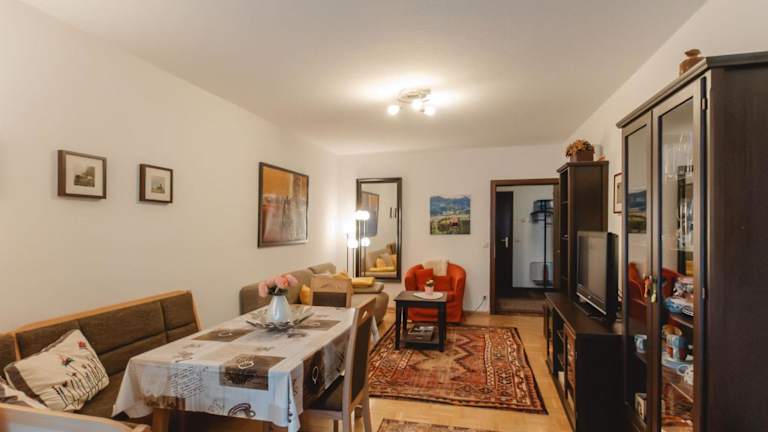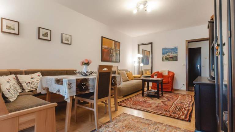 Das Apartment umfasst zwei Schlafzimmer, ein Wohnzimmer mit TV, eine gut ausgestattete Küche mit Kühlschrank und Geschirrspüler sowie ein Badezimmer mit Badewanne. Ein Balkon mit Bergblick ergänzt die Bequemlichkeiten.
