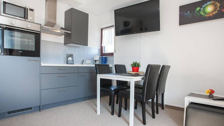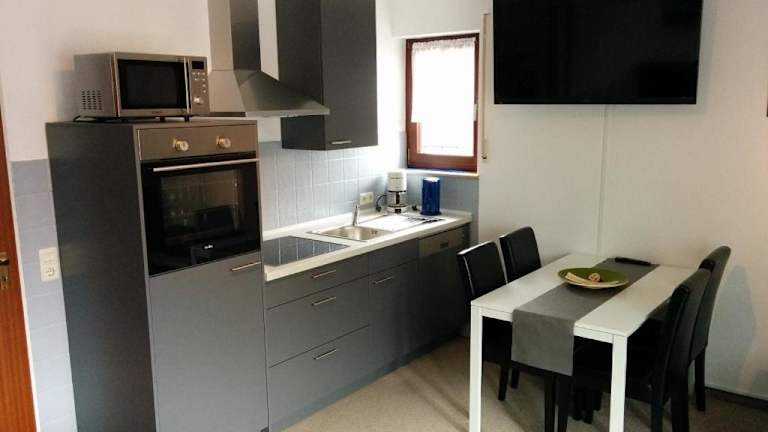 Die Küchenzeile in der Ferienwohnung verfügt über einen Kühlschrank, einen Geschirrspüler, einen Ofen, eine Kaffeemaschine sowie einen Wasserkocher, um die Gäste bei Bedarf mit Selbstverpflegung zu unterstützen.