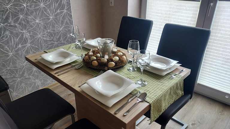 Die Ferienwohnung verfügt über 2 Schlafzimmer, ein Badezimmer, Bettwäsche und Handtücher. Ausstattung beinhalten einen Flachbild-TV mit Satellitenkanälen, einen Essbereich, eine voll ausgestattete Küche sowie eine Terrasse mit Gartenblick.