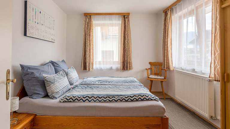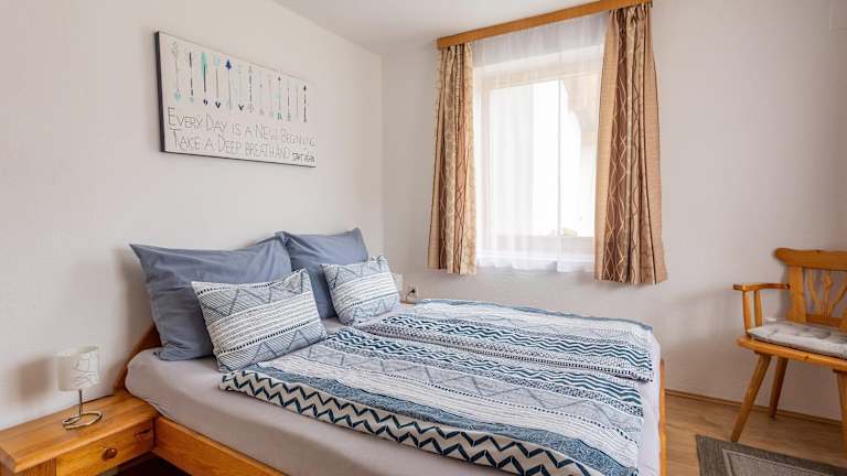 Die Ferienwohnung umfasst ein Schlafzimmer, ein Wohnzimmer sowie eine gut ausgestattete Küche. Es sind sowohl eine Terrasse als auch ein Balkon vorhanden, die Aussicht auf die Berge bieten. Bettwäsche und Handtücher werden bereitgestellt.