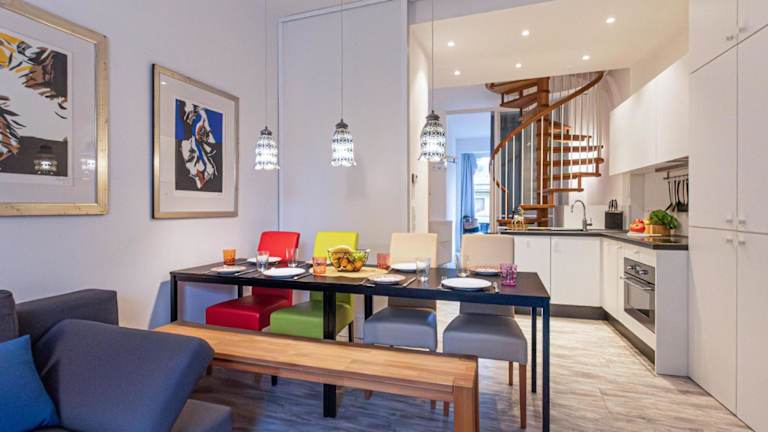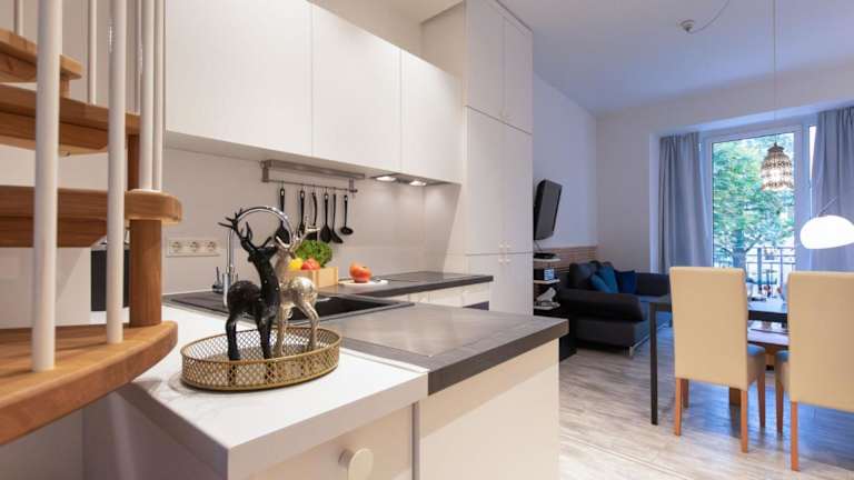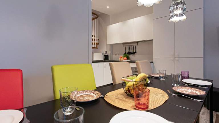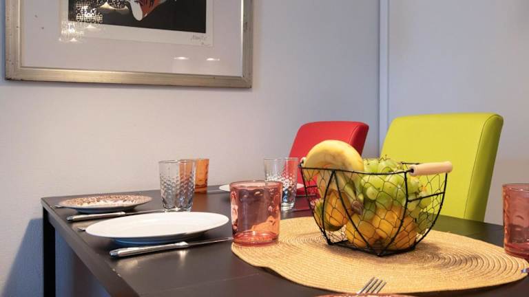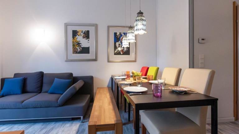 Das Apartment umfasst 3 Schlafzimmer, ein Wohnzimmer mit TV sowie eine gut ausgestattete Küche mit einem Kühlschrank und einem Geschirrspüler. Zudem sind zwei Badezimmer mit Dusche vorhanden.