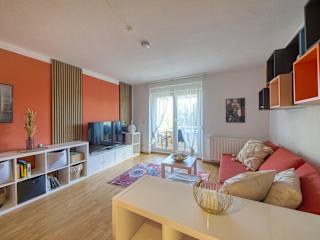 Das Apartment verfügt über 2 Schlafzimmer und ein gemütliches Wohnzimmer mit einem Flachbild-TV. Ein Balkon mit Stadtblick sorgt für eine angenehme Atmosphäre. Zudem gibt es ein Badezimmer mit einer Badewanne, und Handtücher sowie Bettwäsche werden bereitgestellt.