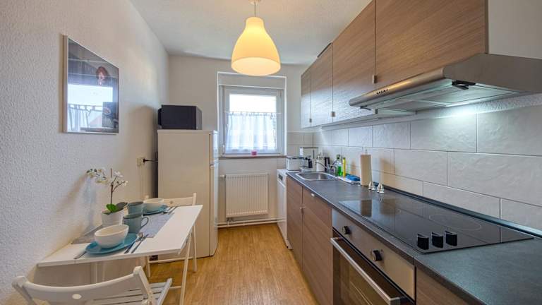 In der gut ausgestatteten Küche der Ferienwohnung finden Gäste alles Nötige, um ihre eigenen Mahlzeiten zuzubereiten. Zu den Einrichtungen gehören ein Kühlschrank und ein Geschirrspüler.