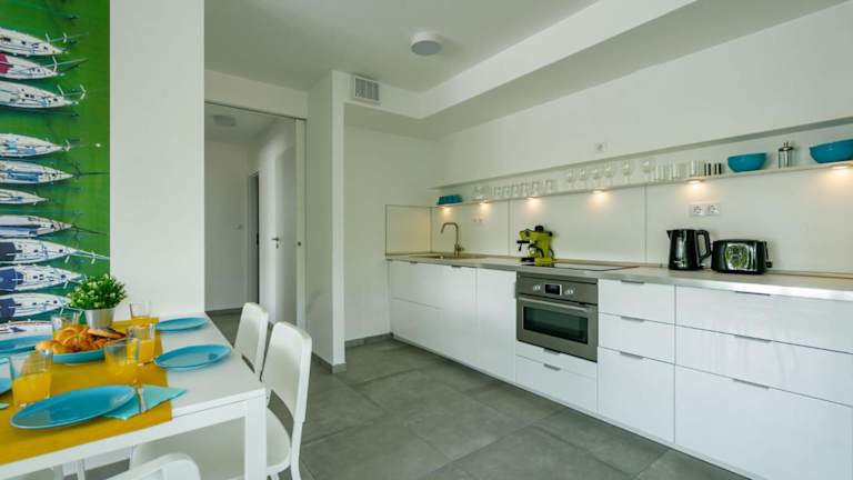Die Ferienwohnung umfasst ein Wohnzimmer mit einem TV mit Kabelkanälen sowie eine voll ausgestattete Küche mit Kühlschrank und Geschirrspüler. Ein Badezimmer mit Dusche gehört ebenfalls zur Ausstattung. Ein Babybett ist auf Anfrage erhältlich, dafür können zusätzliche Gebühren anfallen.