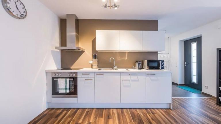 Das Apartment umfasst ein Schlafzimmer, ein Wohnzimmer mit TV, eine gut ausgestattete Küche mit Kühlschrank und Geschirrspüler sowie ein Badezimmer mit Dusche. Handtücher und Bettwäsche werden in der Ferienwohnung bereitgestellt.