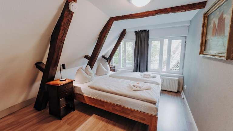 Die Ferienwohnung besteht aus 2 Schlafzimmern, einem Wohnzimmer, einer voll ausgestatteten Küchenzeile sowie einem Badezimmer mit Dusche und kostenlosen Pflegeprodukten. Handtücher und Bettwäsche werden bereitgestellt. Die Decke hat eine Höhe von 1,95 Metern.
