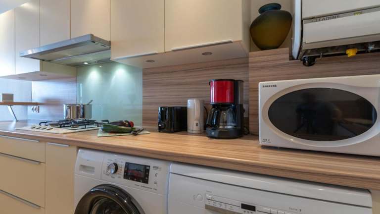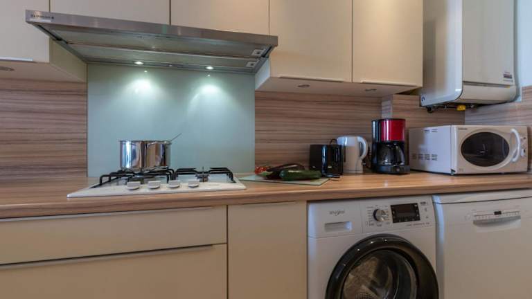 Die Ferienwohnung beinhaltet zwei Schlafzimmer, ein Wohnzimmer mit einem TV sowie eine voll ausgestattete Küche. Handtücher und Bettwäsche können gegen eine Gebühr gemietet werden oder Gäste können eigene mitbringen. Es steht ein Babybett gegen Gebühr zur Verfügung.