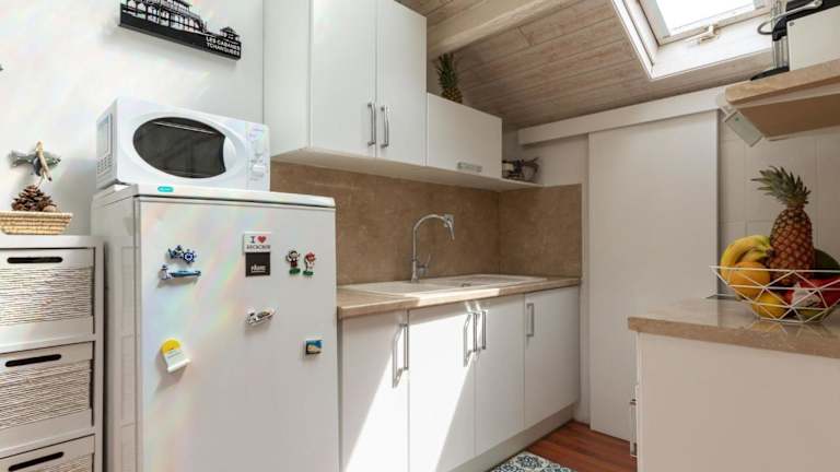 Die Ferienwohnung verfügt über eine voll ausgestattete Küche mit einem Kühlschrank und einer Kaffeemaschine. Es gibt keine weiteren Angaben zu Verpflegungsmöglichkeiten vor Ort.