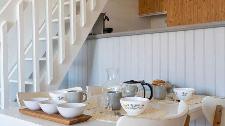 Die Ferienwohnung verfügt über eine gut ausgestattete Küchenzeile mit Kühlschrank, Geschirrspüler und Ofen, wodurch die Zubereitung von eigenen Mahlzeiten leicht möglich ist. Es sind keine weiteren Verpflegungsmöglichkeiten im Apartment erwähnt.