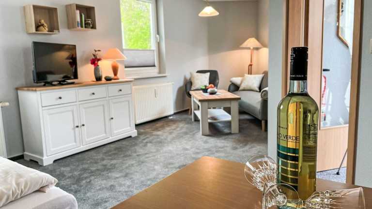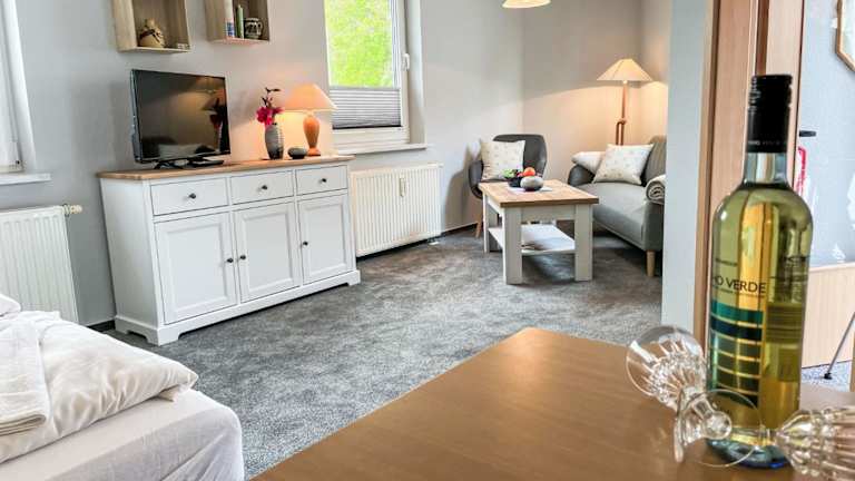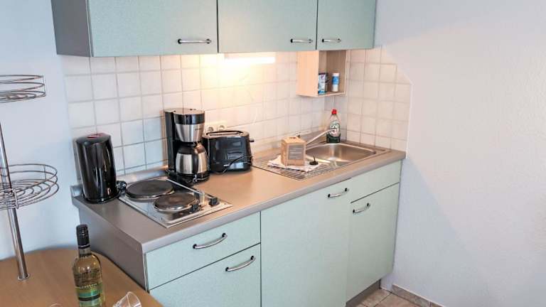 Die Wohnung verfügt über eine Küchenzeile, die mit einem Kühlschrank, einer Herdplatte und einer Kaffeemaschine ausgestattet ist. Eine detaillierte Beschreibung der Verpflegungsmöglichkeiten liegt nicht vor.
