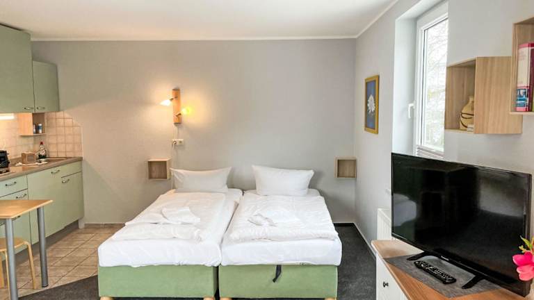 Das Apartment umfasst eine Küchenzeile mit einem Kühlschrank, einer Herdplatte und einer Kaffeemaschine. Zudem gibt es einen TV mit Kabelkanälen. Bettwäsche, Handtücher und Wäsche werden nach den Richtlinien der örtlichen Behörden gewaschen.