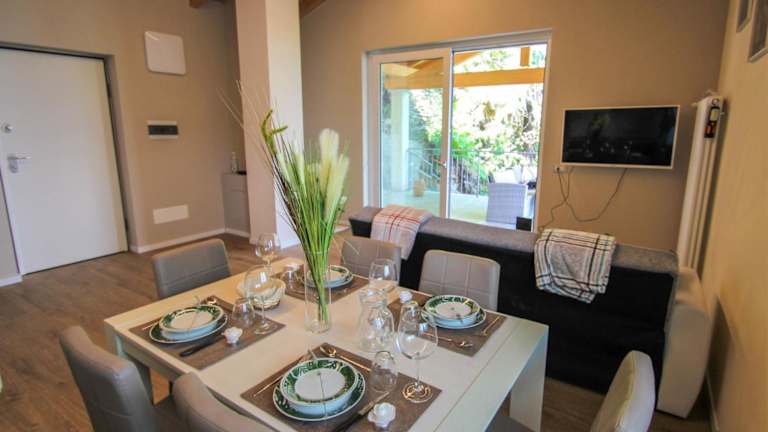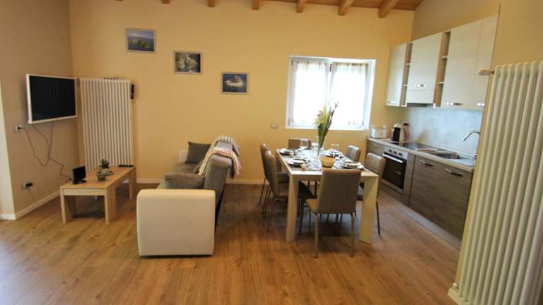 Die Ferienwohnung verfügt über eine gut ausgestattete Küchenzeile mit Kühlschrank, Geschirrspüler und Ofen. Zudem sind ein Badezimmer mit Bidet und Haartrockner vorhanden. Die Einrichtung umfasst auch einen TV und es sind 2 Babybetten verfügbar, wobei Gebühren anfallen können.