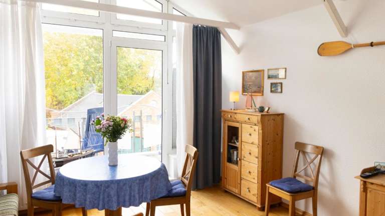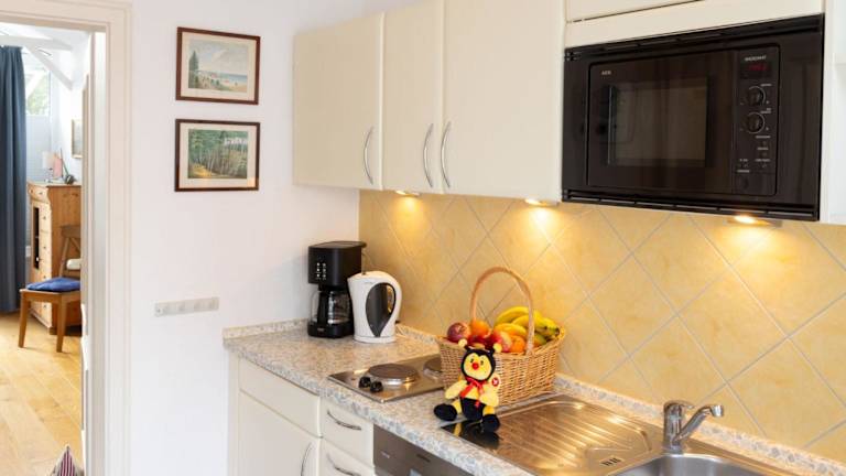 Die Ferienwohnung ist ausgestattet mit einer Küchenzeile, die einen Kühlschrank, Geschirrspüler, Mikrowelle und Kaffeemaschine beinhaltet. Es sind keine weiteren Verpflegungsmöglichkeiten verfügbar.