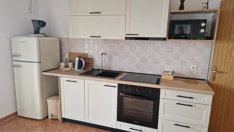 Die Unterkunft verfügt über eine voll ausgestattete Küche mit Kühlschrank, Geschirrspüler, Ofen, Mikrowelle, Herdplatte, Kaffeemaschine und Wasserkocher, sodass den Gästen die Zubereitung ihrer eigenen Mahlzeiten ermöglicht wird.