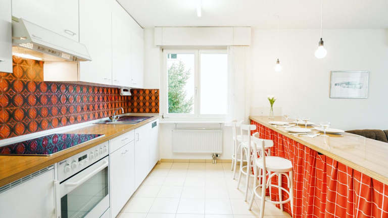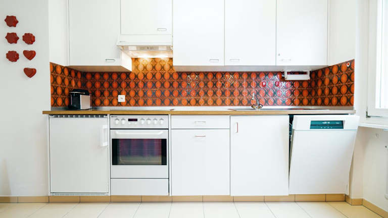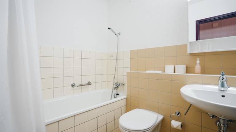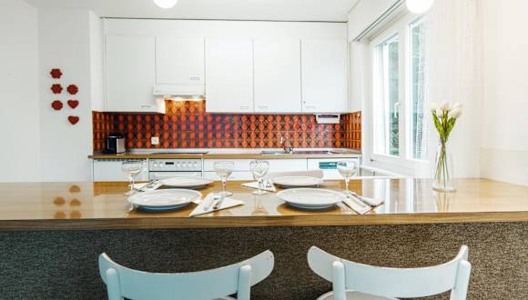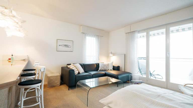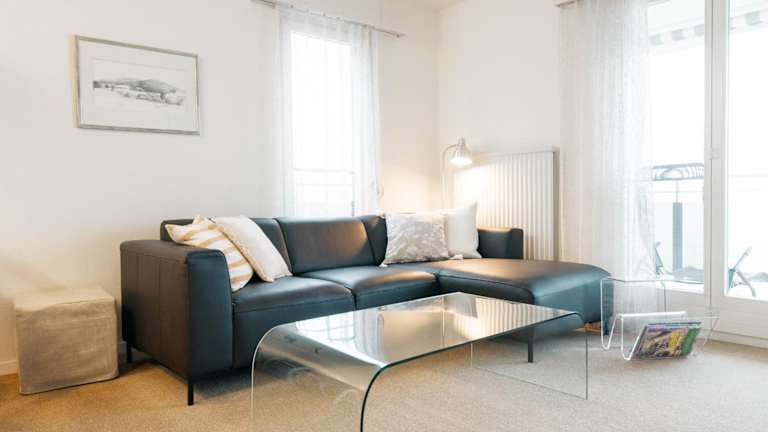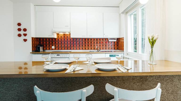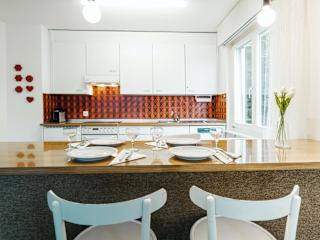 Das Apartment umfasst ein Schlafzimmer, ein Wohnzimmer und eine gut ausgestattete Küche mit Kühlschrank und Geschirrspüler. Handtücher und Bettwäsche werden bereitgestellt.