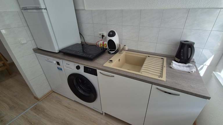 Die Ferienwohnung besteht aus einem Schlafzimmer und ist ausgestattet mit einem Flachbild-TV sowie einer Küchenzeile, die einen unabhängigen Aufenthalt ermöglicht.