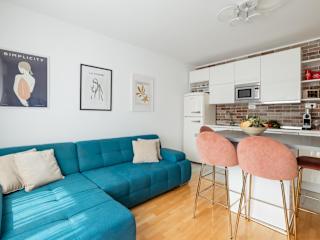 Die Ferienwohnung im Aurelia City Centar verfügt über zwei Schlafzimmer und zwei Badezimmer. Zur Ausstattung gehören Bettwäsche, Handtücher, ein Flachbild-TV mit Kabelkanälen, sowie eine voll ausgestattete Küche mit Kühlschrank und Kaffeemaschine. Das Apartment ist klimatisiert und bietet einen Essbereich sowie einen Balkon mit Stadtblick.