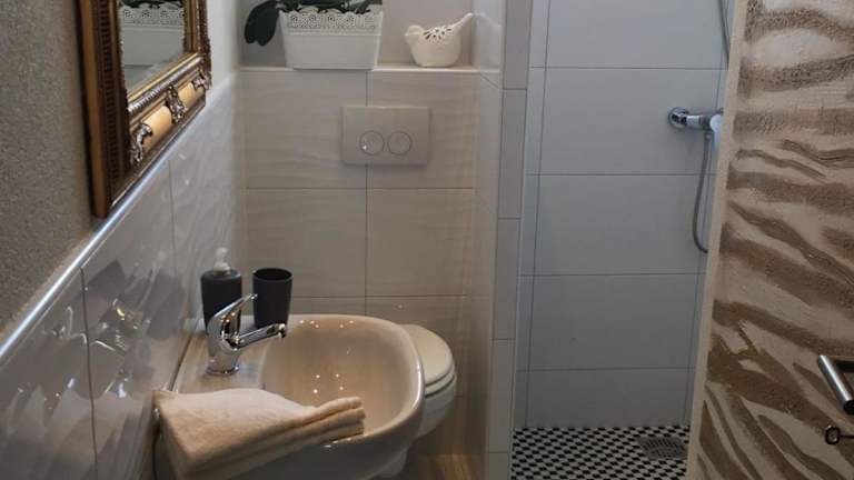 Das Apartment Silva ist funktional eingerichtet und bietet alles, was Sie für einen angenehmen Aufenthalt benötigen. Es verfügt über ein gemütliches Schlafzimmer und ein Badezimmer mit Haartrockner. Der Wohnbereich ist mit einem Schlafsofa und einem Flachbild-TV ausgestattet, so dass Sie sich nach einem langen Tag entspannen können. Die Küchenzeile ist mit einer Mikrowelle und einem Wasserkocher ausgestattet, so dass Sie sich bequem Ihre eigenen Mahlzeiten zubereiten können. Von Ihrem Zimmer aus genießen Sie einen schönen Blick auf den Garten.