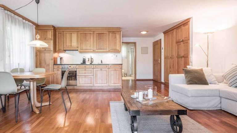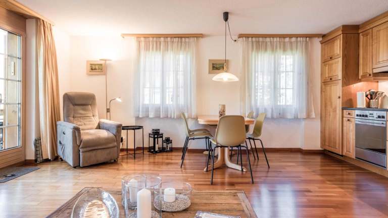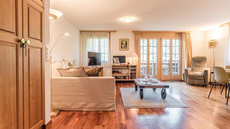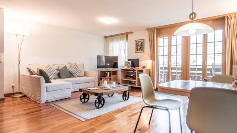 Die Ferienwohnung verfügt über ein Schlafzimmer, ein Wohnzimmer, eine gut ausgestattete Küche mit Kühlschrank und Geschirrspüler sowie ein Badezimmer mit Dusche. Zudem stehen den Gästen eine Terrasse mit Bergblick, Handtücher und Bettwäsche zur Verfügung. Ein Flachbild-TV sorgt für Unterhaltung.