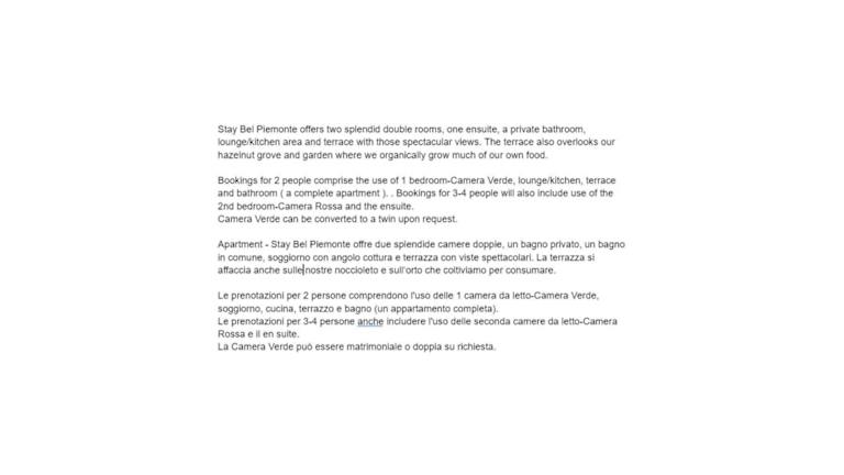 Das Apartment Stay Bel Piemonte bietet Gästen eine heimelige Unterkunft mit einem Garten und einer Terrasse. Das Haus wird von einem privaten Gastgeber geführt und bietet eine Nichtraucherunterkunft (alle öffentlichen und privaten Bereiche sind Nichtraucherzonen).