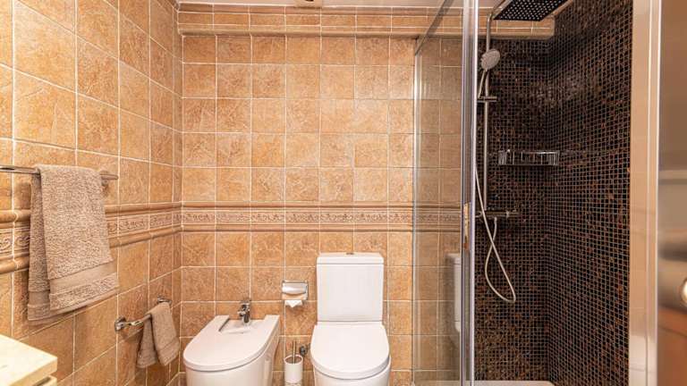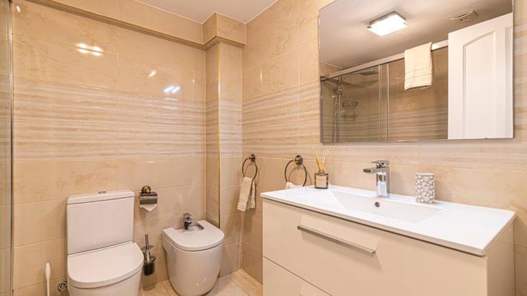 Die Ferienwohnung umfasst zwei helle Schlafzimmer sowie ein gemütliches Wohnzimmer mit einem Flachbild-TV. Zur weiteren Ausstattung gehört eine gut eingerichtete Küche mit Kühlschrank und Ofen, zwei Badezimmer, die extra mit einem Bidet ausgestattet sind, und ein Balkon. Handtücher und Bettwäsche sind vorhanden. Die Aussicht auf die Stadt und das Meer sorgt für eine entspannende Umgebung.