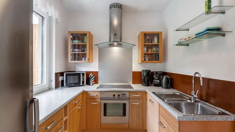 Die Ferienwohnung umfasst drei Schlafzimmer, ein Wohnzimmer mit TV, eine gut ausgestattete Küche mit Kühlschrank und Geschirrspüler sowie ein Badezimmer mit Badewanne. Handtücher und Bettwäsche werden bereitgestellt.