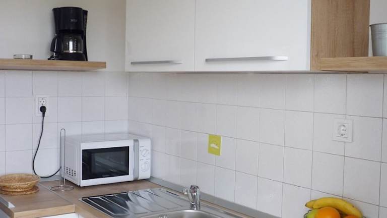 Die Küche ist mit einer Mikrowelle ausgestattet, die zur Selbstverpflegung einlädt.