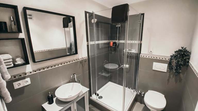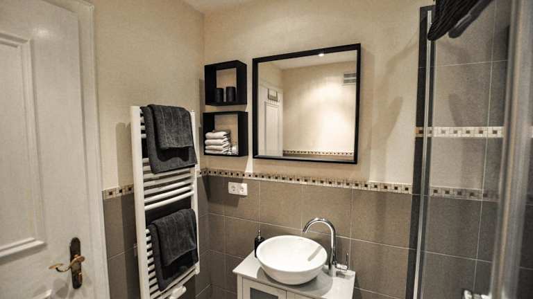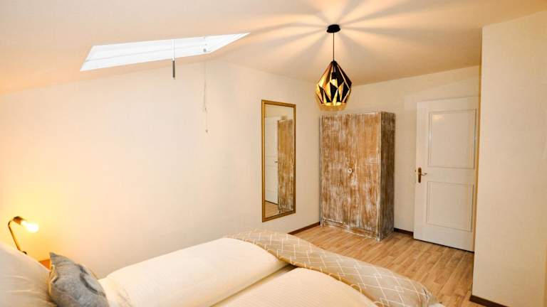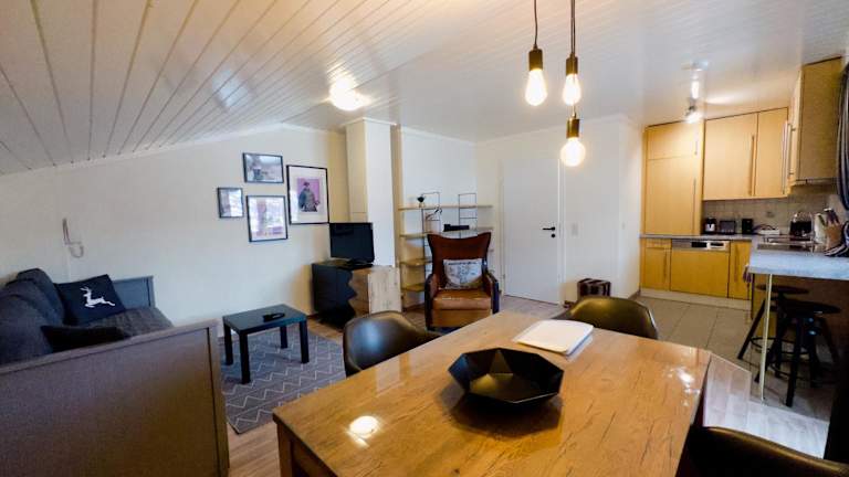 Die Ferienwohnung ist mit einem Schlafzimmer ausgestattet und umfasst eine Küche mit Kühlschrank und Geschirrspüler. Ein Flachbild-TV sowie ein gemütlicher Sitzbereich sind ebenfalls vorhanden. Das Badezimmer ist mit einer Dusche ausgestattet. Für die Gäste stehen Handtücher und Bettwäsche bereit.