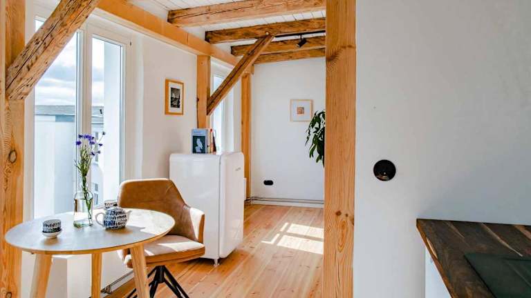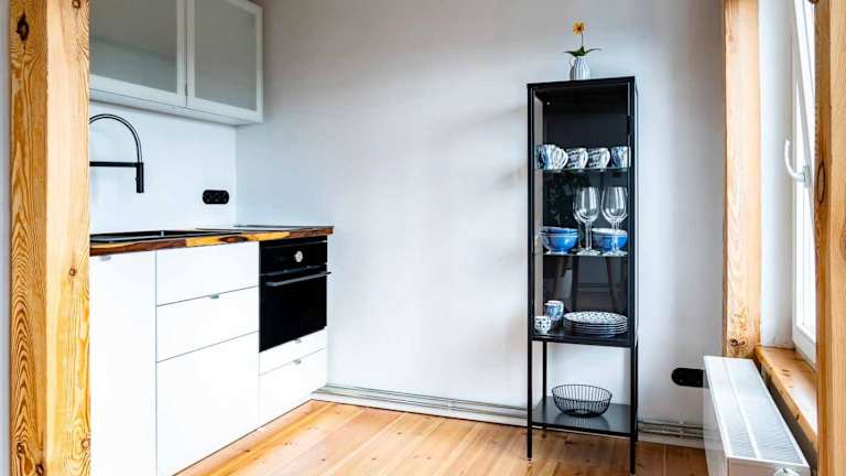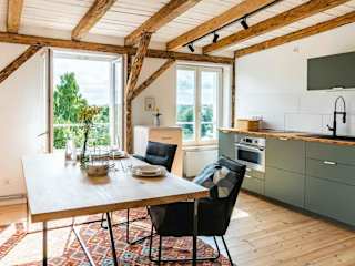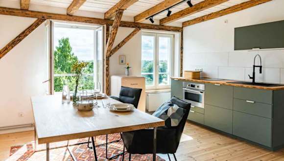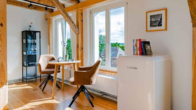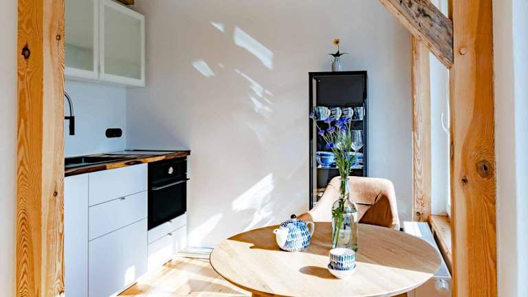 Die Wohneinheiten sind mit einer Küche ausgestattet, die einen Essbereich umfasst.