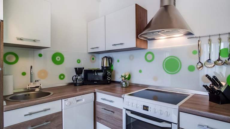 Die Apartments verfügen über einen eigenen Balkon mit Gartenblick, einen Sitzbereich sowie einen Flachbild-TV. Eine voll ausgestattete Küche mit Kühlschrank, Ofen, Herdplatte und Kaffeemaschine ergänzt die Ausstattung. Das eigene Badezimmer ist mit einer Dusche ausgestattet.