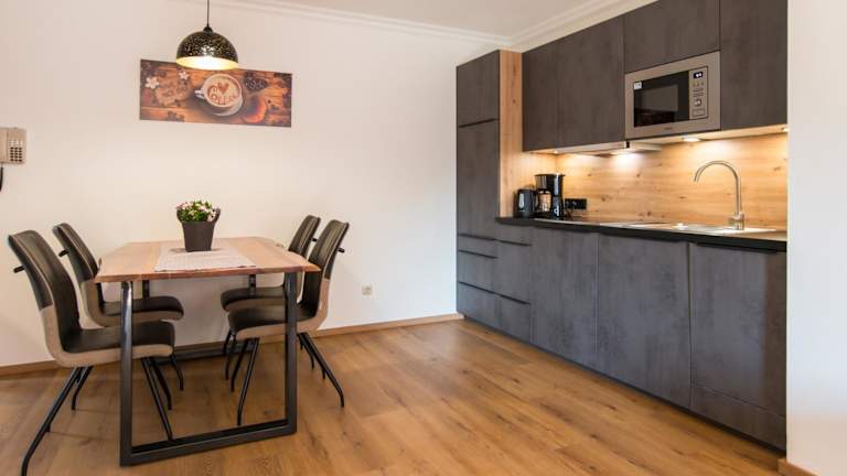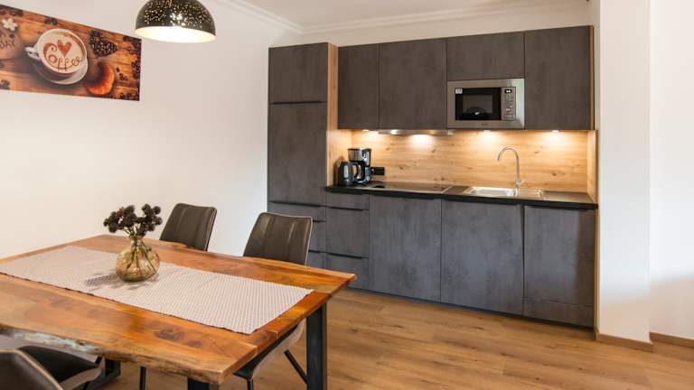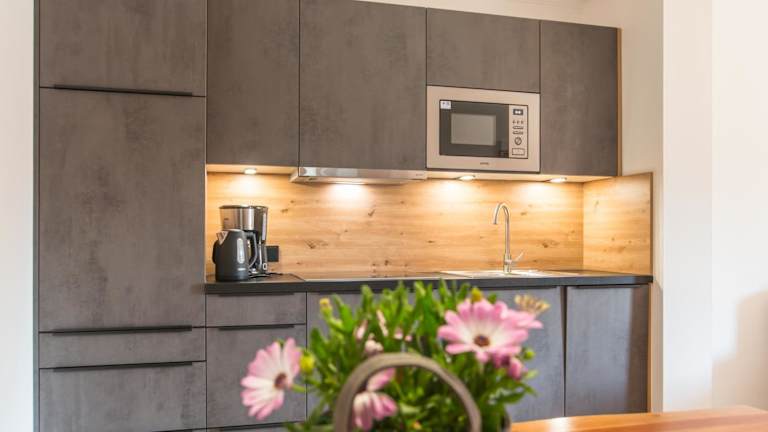 Die Appartements verfügen über eine voll ausgestattete Küche mit Kühlschrank, Geschirrspüler, Herdplatte, Mikrowelle, Toaster, Kaffeemaschine und Wasserkocher, sodass sich Gäste selbst versorgen können.