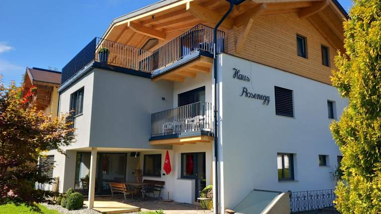 Die Wohneinheiten im Haus Rosenegg sind mit einem Sitzbereich, einem Satelliten-Flachbild-TV, einer voll ausgestatteten Küche (Kühlschrank und Herdplatte), sowie einem eigenen Badezimmer mit Dusche und Haartrockner ausgestattet. Einige Wohnungen verfügen über eine Terrasse oder einen Balkon mit Blick auf die Berge oder den Garten. Es sind zudem allergikerfreundliche Zimmer verfügbar.