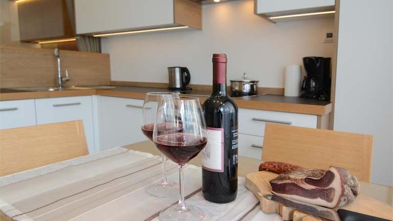 Die Ferienwohnung besteht aus einem Schlafzimmer, einem Wohnzimmer, sowie einer voll ausgestatteten Küche mit Kühlschrank und Kaffeemaschine. Sie verfügt zusätzlich über ein Badezimmer mit Bidet und Badewanne. Handtücher und Bettwäsche werden zur Verfügung gestellt.